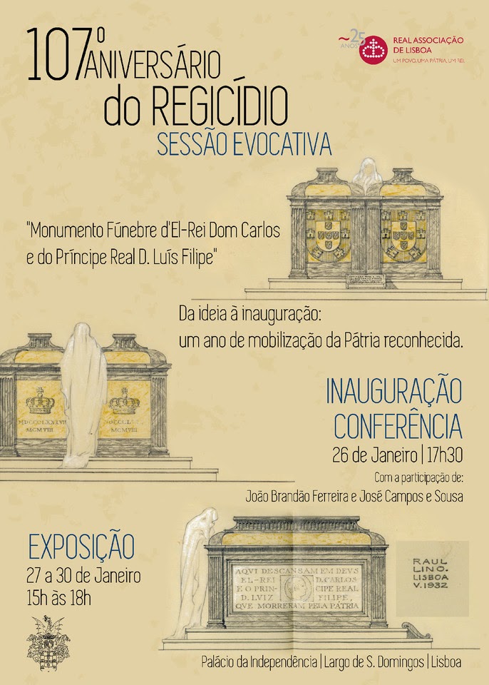 A Real Associação de Lisboa promove no próximo dia 26 de Janeiro pelas 17h30m no Salão Nobre da Sociedade Histórica da Independência de Portugal uma sessão evocativa dos 107 anos sobre o trágico assassinato de Sua Majestade o Rei Dom Carlos e de Sua Alteza Real o Príncipe Dom Luís Filipe. Nessa ocasião será proferida uma alocução pelo Ten. Cor. João Brandão Ferreira. José Campos e Sousa apresentará a exposição “Monumento Fúnebre d’El-Rei Dom Carlos e do Príncipe Real D. Luís Filipe – Da ideia à inauguração: um ano de mobilização da Pátria reconhecida” e interpretará alguns temas musicais alusivos. A exposição estará patente ao público no Palácio da Independência de 27 a 30 de Janeiro, das 15h às 18h.